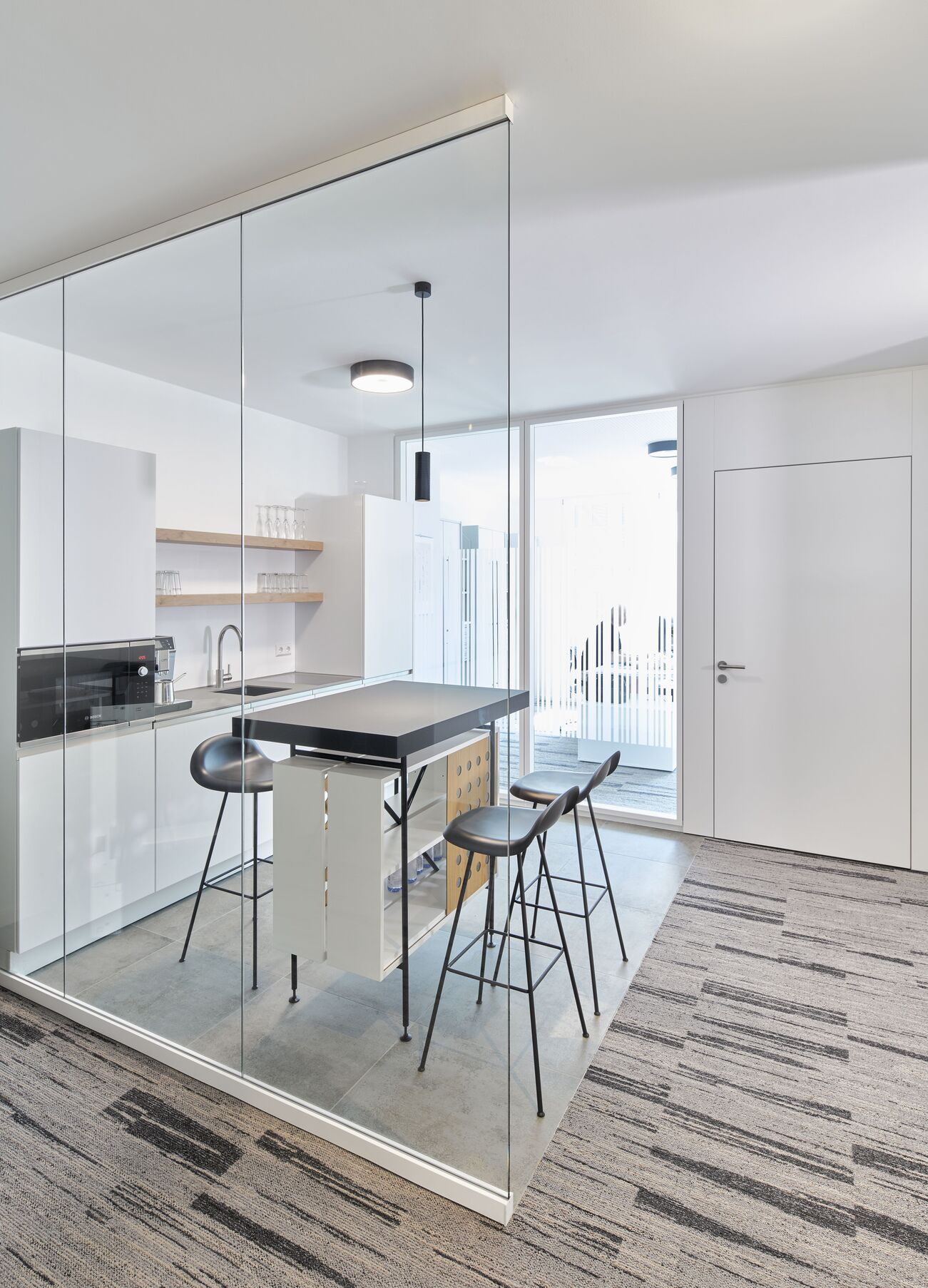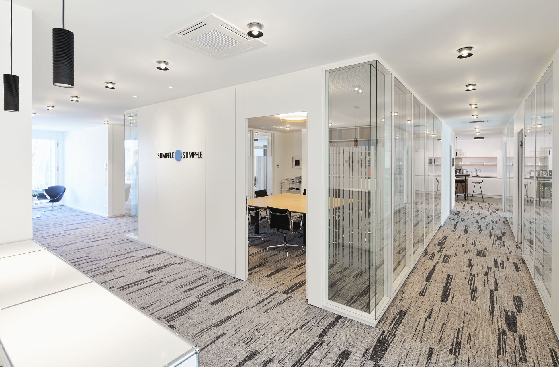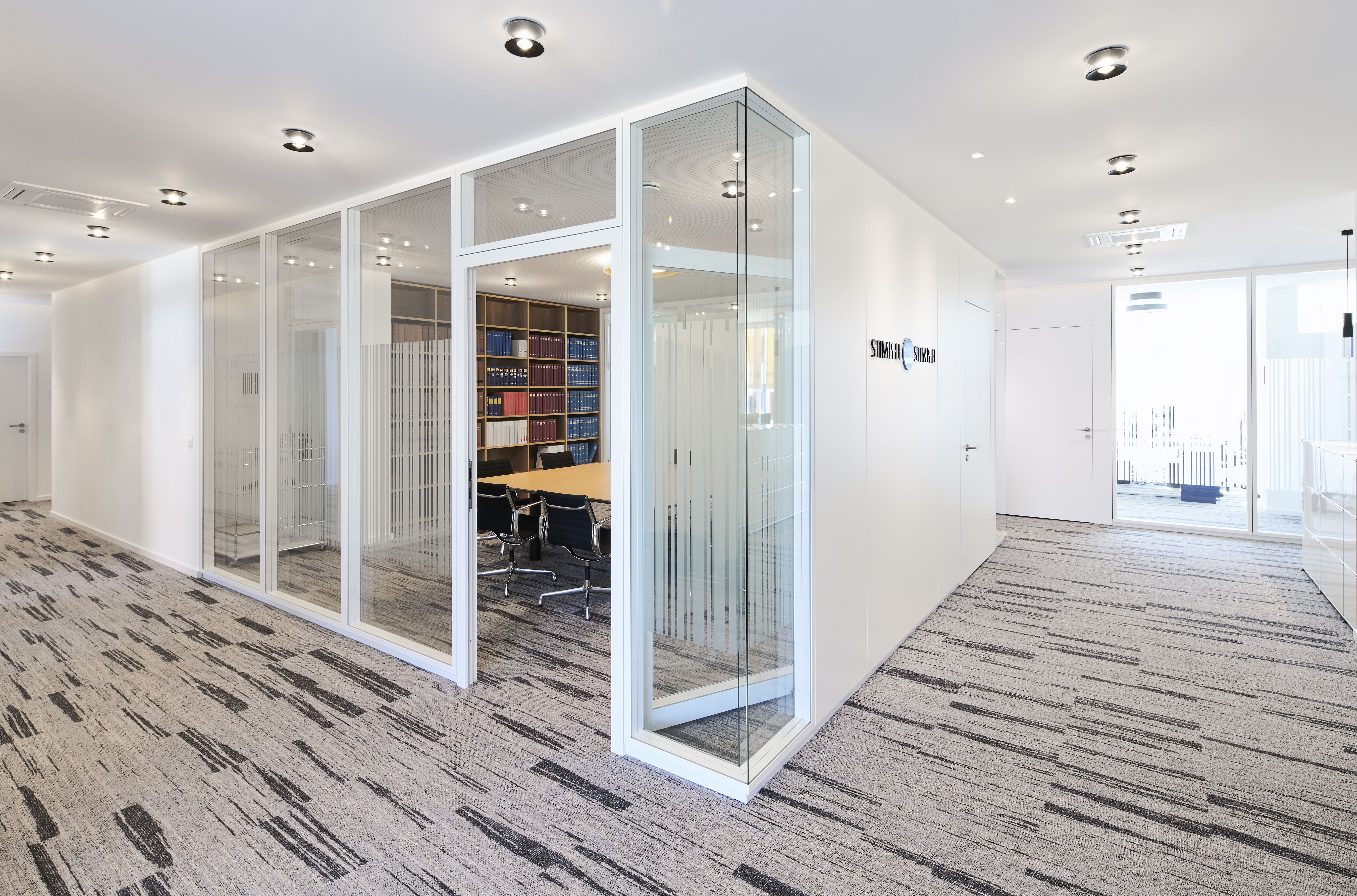 Ein in die Jahre gekommene Notariat wurde erfolgreich in eine moderne Kanzlei umgewandelt, wobei offene und kommunikative Bereiche sowie der innenliegende Besprechungsraum mit seinen transluzenten Systemtrennwänden die Einzelbürostruktur auflockern.